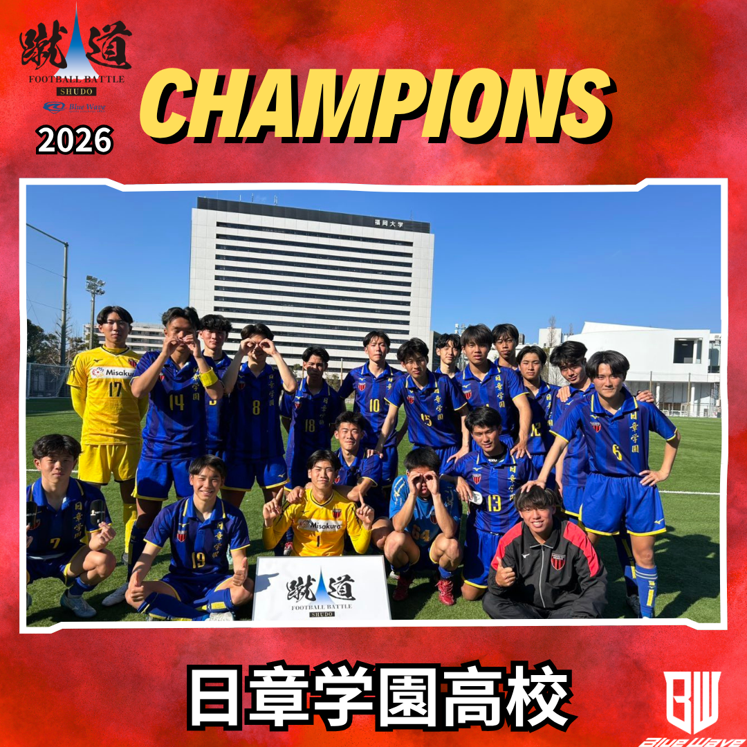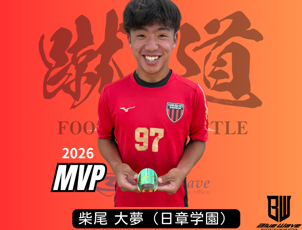 【写真掲載】蹴道blue 優勝は日章学園高校!MVPは柴尾選手(日章学園) 2026年度の蹴道blue 優勝は日章学園高校に決定しました。MVPは柴尾大夢選手(日章学園)です。▼優勝 日章学園高校▼MVP 柴尾大夢選手 お知らせ一覧へ戻る